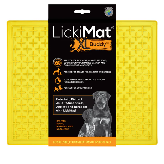 LickiMat ® Classic Buddy Xl er henntugt fyrir miðt til særri hunda og hvetur til slökunar. Þessi motta hentar líak til að deila . Fullkomið fyrir gæludýra nammi, jógúrt, hnetusmjör, álegg, hráfóður, fljótandi fóður, gæludýrafóður. Hæg fóðrun, góður og skemmtileg viðbót við hægfóðurskál. Fáanlegt í ýmsum litum.