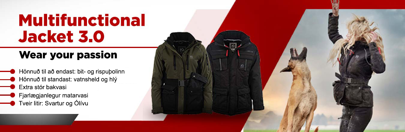 Snjór, rok, rigning eða stormur? Komdu með það! IQ Multifunctional Jacket 3.0 er vel fóðraður til þess að þú getur verið eins lengi úti og þú kýst. Úlpan er notaleg og auka flísfóðrun í vösum og kraga heldur höndum sem og hálssvæði heitu Geymið sveigjanlega tauma, bitpúða eða hvaðeina sem þú gætir þurft í extra stóra auðkennisvasanum okkar. Segðu bless við alla grófa matarafganga í jakkanum þínum. Fjarlægðu einfaldlega húðaða matarvasana eftir þjálfun og þvoðu þá.
